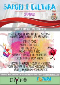 Sambuci – Sabato 5 Ottobre a partire dalle ore 17.30 incantevoli degustazioni di vini locali e nazionali, strepitosi street food, seducenti prodotti tipici a km0, deliziose fritture di pesce, prodotti del bosco, salumi e formaggi dal produttore ammaliante, laboratorio di pasta fresca.
