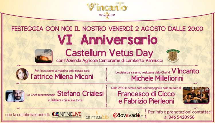 Carsoli – Al via i festeggiamenti per il VI anniversario dalla apertura del noto locale ricettivo situato a Carsoli in via Tiburtina Valeria nei pressi dell’uscita autostradale di Carsoli-Oricola A24. L’appuntamento al V’Incanto Enoteca è per la serata di Venerdì 2 Agosto quando si apriranno le porte del Castellum Vetus Day, un evento unico nel suo genere in cui sarà presente tutto quanto ruota intorno al founder Daniele Berardini. Protagonista l’Azienda Agricola Centorame di Lamberto Vannucci, unitamente all’attrice Milena Miconi, al grande che internazionale Stefano Crialesi che delizierà la serata con le sue splendide torte. E poi lo chef di V’Incanto Michele Millefiorini oltre alla musica live di Francesco Di Cicco e Fabrizio Pierleoni. Sarà una occasione tutta da vivere sia nell’esterno della terrazza panoramica con vista sulla Piana del Cavaliere e nelle amplissime sale interne. Sarà tutto un open space per questa occasione.