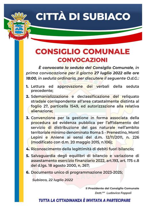 SUBIACO – E’ stata disposta la convocazione del consiglio comunale di Subiaco per il 27 luglio 2022, di seguito il dettaglio con l’ordine del giorno