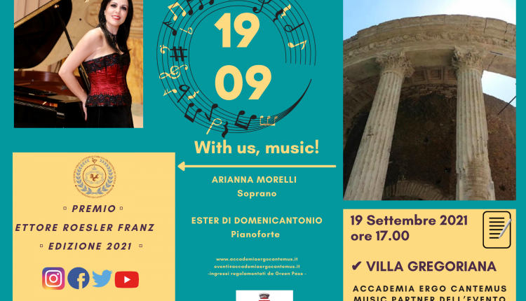 Nella sala della Villa Gregoriana saranno eseguite le più famose arie d’opera con la splendida vocalità della soprano Arianna Morelli, accompagnata al pianoforte dalla pianista Ester Di Domenicantonio.