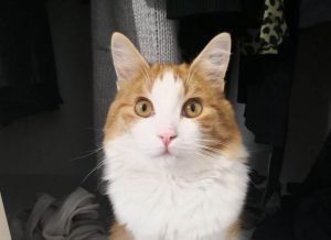 Razza e descrizione: Gatto Procione – Bianco sotto e sopra Rosso con coda grande, maschio.