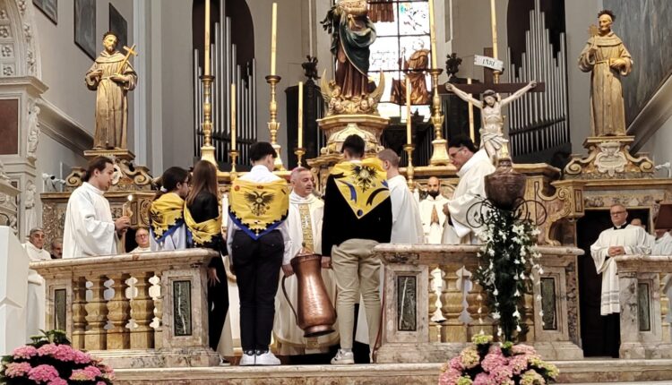 Per la Solennità è ritornata a essere posta dinanzi al Mausoleo Bernardiniano, dopo le vicissitudini conseguenti al furto perpetrato dodici mesi fa e al suo prontissimo ritrovamento da parte dell’Arma dei Carabinieri, la restaurata lampada votiva in ferro battuto e rame sbalzato che fu donata dalla Nobile Contrada dell’Aquila nel 1957, anno in cui appunto nacque il rito dell’offerta dell’olio. Alle ore 17,30 sul sagrato della Basilica sono stati accolti i Sindaci dei comuni – con i rispettivi gonfaloni – che hanno voluto essere presenti, quindi davanti al Mausoleo ha avuto luogo la cerimonia di affidamento a San Bernardino impreziosita da un’esibizione in suo onore del Gruppo Storico Sbandieratori Città di L’Aquila. La Santa Messa Solenne delle ore 18 – animata come quella della mattina dal Coro della Basilica – è stata presieduta da Mons. Sabino Iannuzzi, Vescovo di Castellaneta (TA), alla presenza dei fedeli e – in particolare – delle confraternite della Città dell’Aquila e dei paesi limitrofi devote al Santo.