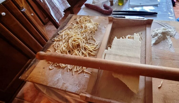Il nome “spaghetti alla chitarra” deriva dalla forma degli spaghetti stessi. Questa pasta è tradizionalmente tagliata in modo quadrato o rettangolare, dando loro una forma simile a quella delle corde di una chitarra. La tecnica per ottenere questa forma coinvolge l’uso di uno strumento chiamato “chitarra,” che è una sorta di telaio con fili di metallo tesi sopra di esso. La pasta viene stesa su questo telaio, e poi si preme con un matterello o un rullo, in modo che passi attraverso i fili di metallo, tagliandola in strisce.
