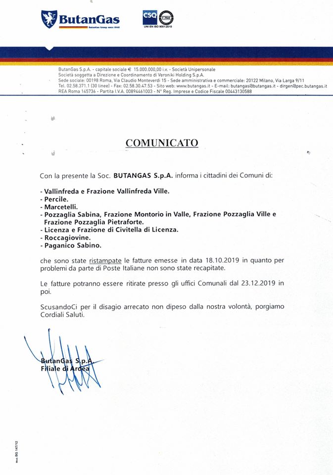 Roccagiovine – Una marea di utenti della Butangas non hanno ricevuto le bollette emesse nell’ottobre 2019 per i consumi del Gas. Cosicchè si sono generati diversi problemi: richieste da parte dell’erogatore, ma poi si è appurato che le bollette regolarmente spedite sono “sparite” dai circuiti di Poste Italiane. E di qui, grazie agli interventi degli amministratori comunali, con particolare dedizione del consigliere Piero Moltoni di Roccagiovine, si è riusciti ad ottenere la ristampa delle bollette e per evitare problemi la Butangas le consegnerà a mano presso i comuni di residenza degli utenti. Per ritirare la fattura basta recarsi presso la casa comunale negli orari di apertura.