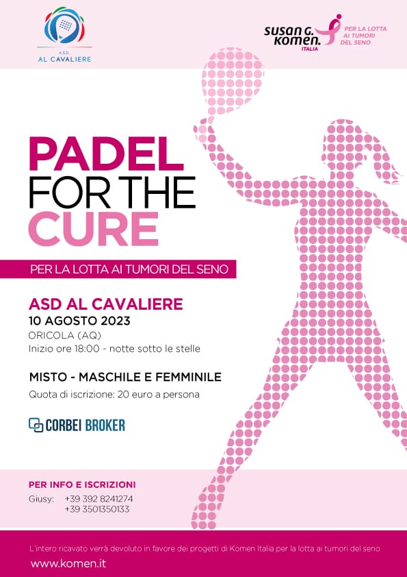 PIANA DEL CAVALIERE – L’appuntamento è per giovedì 10 agosto 2023 start h 18,00 quando nei campi Padel della Asd “Al Cavaliere” in Civita di Oricola, prenderà il via una interessante iniziativa che lega lo sport alla solidarietà: il Padel for the cure.