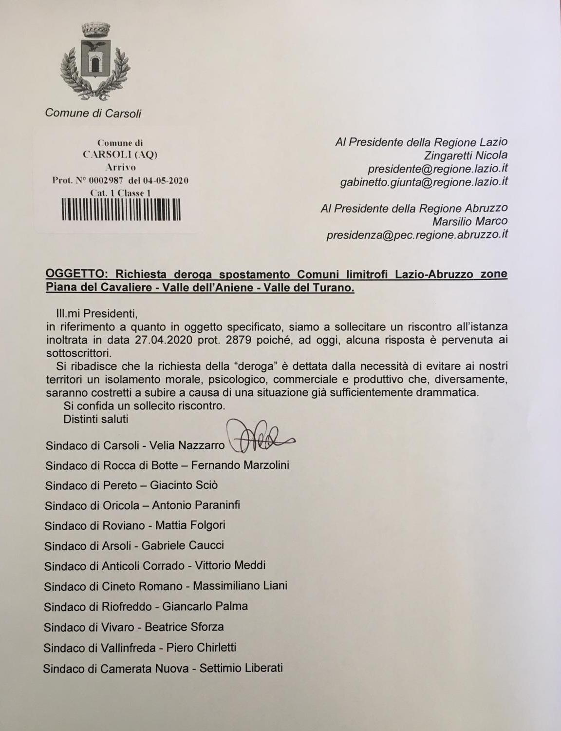 Carsoli – Tutto tace, dopo la missiva inviata da una delegazione dei sindaci di comuni compresi tra la Piana del Cavaliere, Valle dell’Aniene e Valle del Turano, con la quale si richiede la deroga agli spostamenti per queste zone di confine.