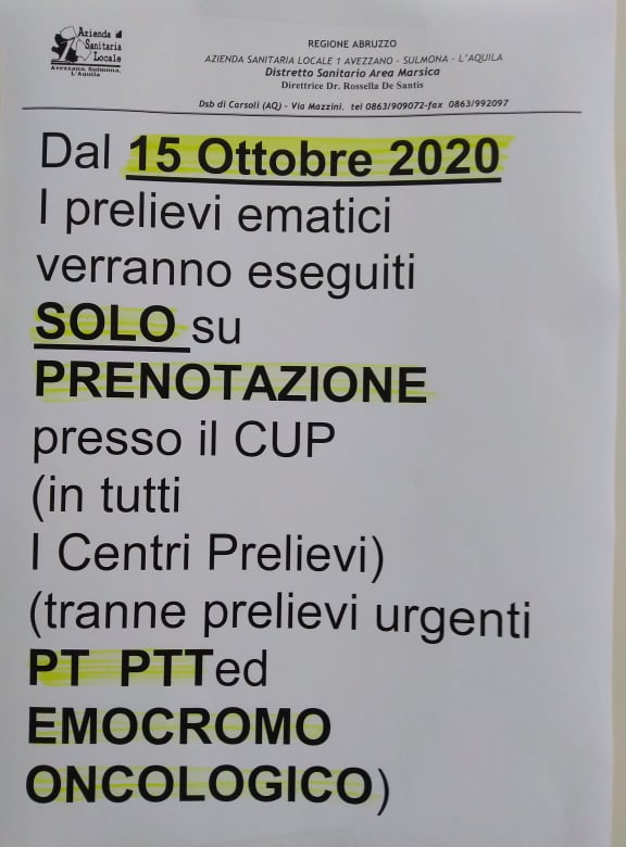 Carsoli – I prelievi ematici saranno eseguiti solo previo appuntamento presso il distretto sanitario di Base di Carsoli. La decorrenza è il 15 ottobre 2020, quindi gli utenti dovranno prenotarsi presso il cup.
