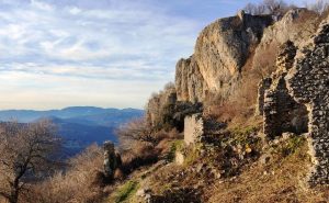 Ammiriamo un banco di travertino nel quale le foglie di faggio, perfettamente riconoscibili sono ammassate come sotto un torchio, sono tanto perfette che sembrano soltanto tinte del colore del travertino. Il viottolo si fa sempre più ripido e finalmente giungiamo ad una piccolissima cappella dove il Santuario, colla sua rupe ci si mostra in modo veramente imponente, una roccia di calcare grigio, ranciata qua e là dall’ossido di ferro, che cade a picco come la facciata d’una casa per 250 metri sul pendio ripidissimo della montagna in mezzo si vede il Santuario, che pare un giocattolo, e i grandi alberi dei vicini monti, faggi, quercie ed aceri paiono semplici cespugli.