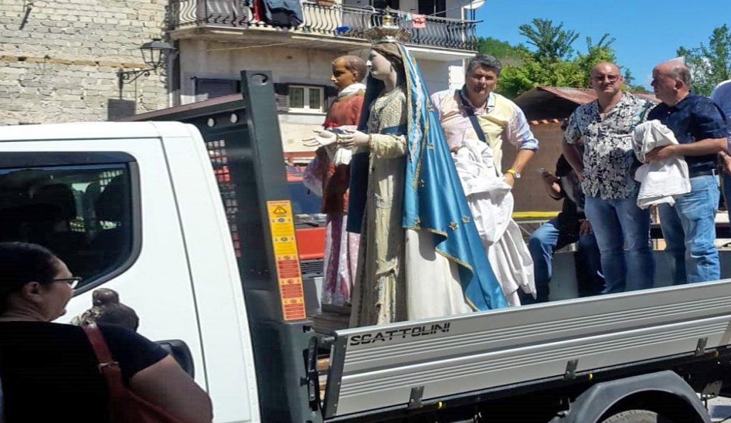 Carsoli. La strada è impraticabile a causa delle buche e il santo patrono e la Madonna vengono riportati in chiesa con un camioncino.