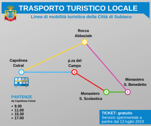 Subiaco – Partirà il 13 luglio 2019 il servizio di trasporto turistico che collegherà il centro urbano ai maggiori siti di interesse della Città: Rocca Abbaziale e Monasteri di Santa Scolastica e San Benedetto.