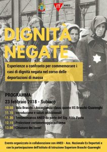 Si terrà domani venerdì 23 febbraio, alle ore 11.00 presso la Sala Braschi di Subiaco, l’incontro con l’Associazione Nazionale ex Deportati – ANED per affrontare con i ragazzi dell’Istituto Braschi-Quarenghi il tema delle dignità negate nel corso delle deportazioni di massa.L’iniziativa, che celebra la Giornata della Memoria, vuole rinnovare il ricordo di situazioni e azioni che abbiamo l’obbligo morale di ricordare. Rivolto agli studenti delle classi superiori, l’incontro è pubblico e aperto a chiunque desideri partecipare.Aldo Pavia, Vicepresidente ANED e figlio di un deportato di guerra, rilascerà una testimonianza e guiderà i ragazzi con materiale appositamente selezionato. Presenti i ragazzi delle classi quinte dell’IIS Braschi-Quarenghi di Subiaco, condotti all’evento da un percorso didattico seguito in classe che li ha visti protagonisti, il 27 gennaio scorso, di iniziative a tema. L’iniziativa è stata supportata e sostenuta dal corpo docente.