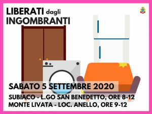 Subiaco – Sabato 5 settembre prossimo è garantita la raccolta rifiuti ingombranti a Subiaco – l.go S. Benedetto, ore 8.00 – 12.00, e presso Monte Livata – loc. Anello, ore 9.00 – 12.00.