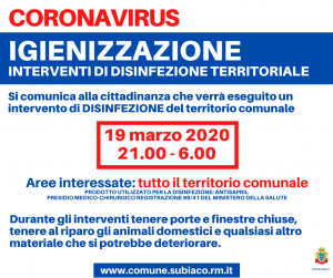 Scortata dalla Protezione Civile Centro Radio Soccorso di Subiaco, la ditta specializzata è intervenuta su tutto il centro urbano, contrade e frazioni, compresi gli ingressi dei complessi abitativi di Monte livata. Igienizzati ulteriormente  l’ Ospedale “Angelucci”,  il Capolinea Cotral di Subiaco e tutti gli uffici e gli esercizi che garantiscono ancora l’apertura secondo la disposizione del decreto legislativo.