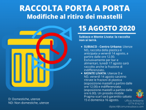 Subiaco – Sabato 15 agosto, in occasione del Ferragosto, non si terrà l’ordinaria raccolta porta a porta a Subiaco e Monte Livata.
