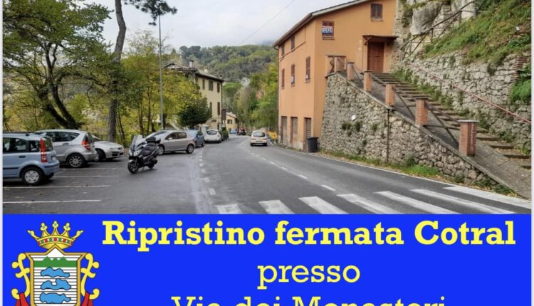 Dopo numerose interlocuzioni, in un clima di collaborazione con la società Cotral e con i referenti locali del deposito, il •Sindaco Domenico Petrini può annunciare il ripristino della fermata Cotral sita in Via dei Monasteri, su entrambi i lati.