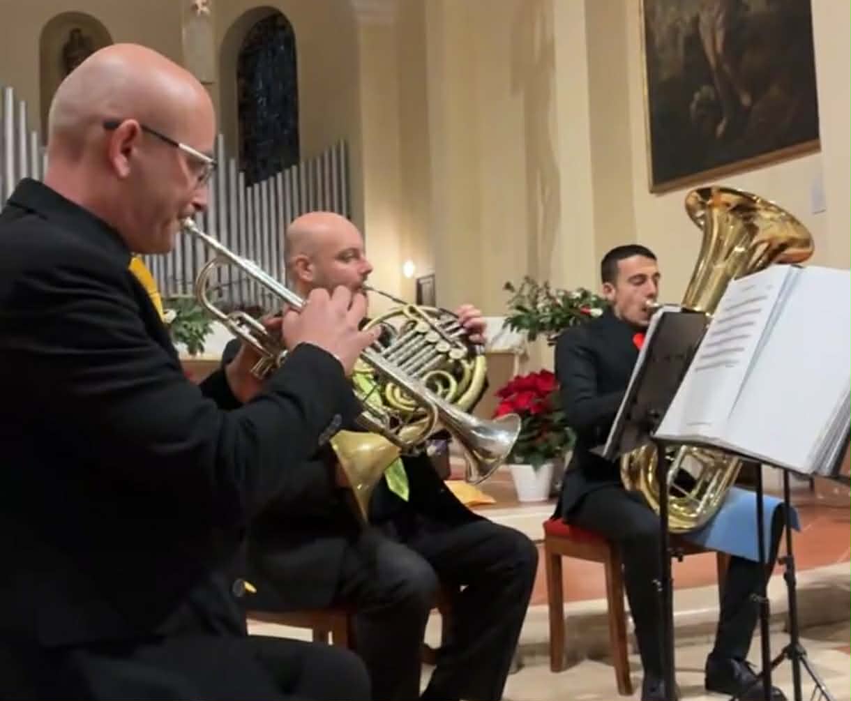 Il quintetto, composto da Giuseppe Iacobucci e Marco Scamolla alle trombe, Giovanni Piacente al corno, Stefano Tomasi al trombone e Alessandro Caretta alla basso tuba, ha proposto un repertorio raffinato e pensato appositamente per il periodo delle festività, conquistando il pubblico con interpretazioni di grande qualità e sensibilità musicale. Lunghi e calorosi applausi hanno scandito la serata, a testimonianza dell’apprezzamento e dell’entusiasmo dei presenti.