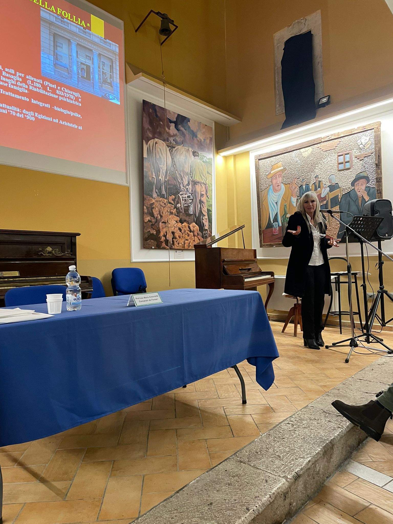 Davanti ad un pubblico numeroso, attento ed interessato, nella bellissima sala polifunzionale, ex chiesa di S. Antonio, la professoressa Coccanari, preceduta dalle note della “Marcia alla Turca” di Mozart, con un linguaggio chiaro, coinvolgente ed esaustivo, arricchito efficacemente dalla proiezione di immagini esplicative, ha parlato di un argomento complesso e sconosciuto ai più: la malattia mentale ed il suo trattamento nella riabilitazione psichiatrica, trattamento che si avvale spesso ed in maniera positiva anche dell’ausilio dell’arteterapia. Ha sottolineato infatti come l’utilizzo delle arti: la musica, il disegno, la scrittura creativa, il teatro e il cinema, siano spesso risolutive per aiutare i pazienti ad acquisire coscienza di sé e ad intraprendere percorsi di recupero.