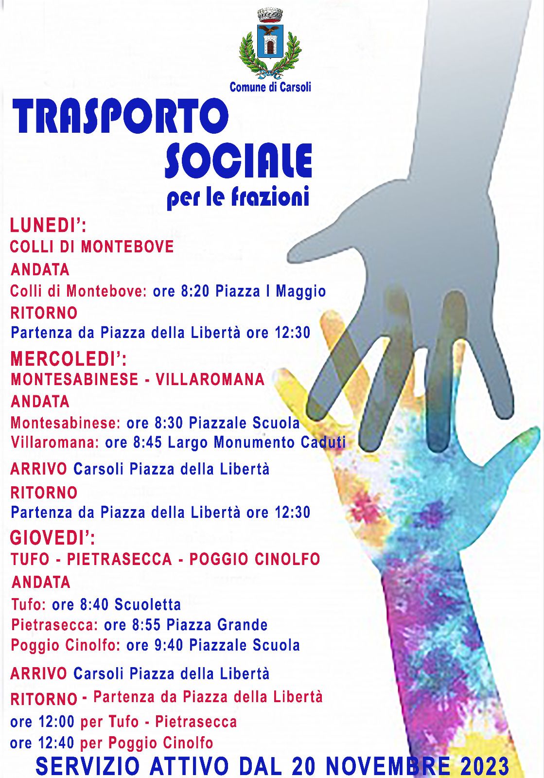 CARSOLI – L’attivazione del nuovo servizio di trasporto sociale è stata sicuramente una iniziativa che ha fatto riscontrare un grande interesse nel territorio e soddisfazione generale. E la prima settimana di avvio è servita anche per testare e valutare l’organizzazione delle corse. “Abbiamo fatto un riscontro nei territori frazionali – spiega il sindaco Velia Nazzarro – e rispetto al programma originario il nostro trasporto sociale è stato ulteriormente attimizzato in base alle esigenze logistiche che sono state rappresentate dai cittadini. Da domani, 20 novembre 2023 infatti c’è un nuovo cronoprogramma che sicuramente sarà in grado di soddisfare tutti. Da tempo lavoravamo a questo progetto, ed ora siamo veramente felici che si sia concretizzato, e grati alla cittadinanza per gli apprezzamenti pervenuti a tal proposito”.
