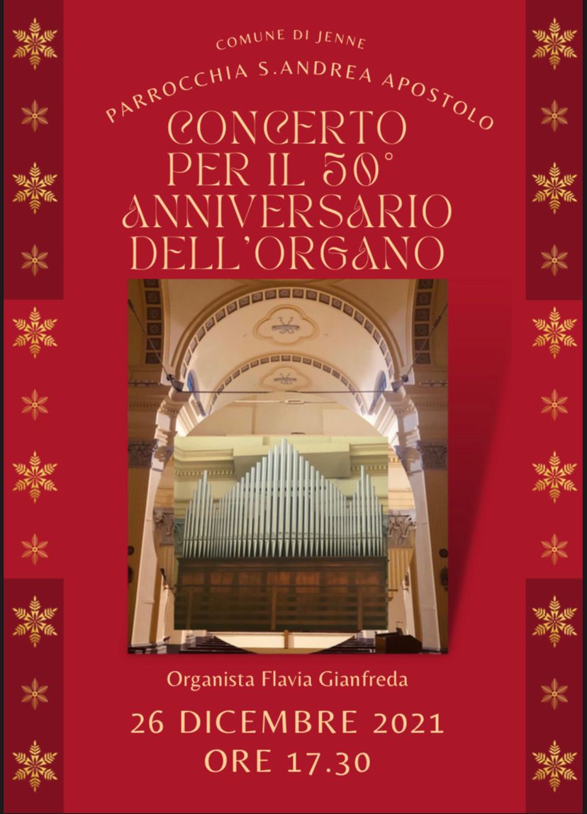 Jenne – L’appuntamento è per Domenica 26 dicembre 2021 alle ore 17,30 nella suggestiva cornice della Chiesa di Sant’Andrea apostolo in Jenne. Nell’occasione sarà celebrato ufficialmente il cinquantesimo anniversario della installazione del bellissimo organo che domina nella navata.