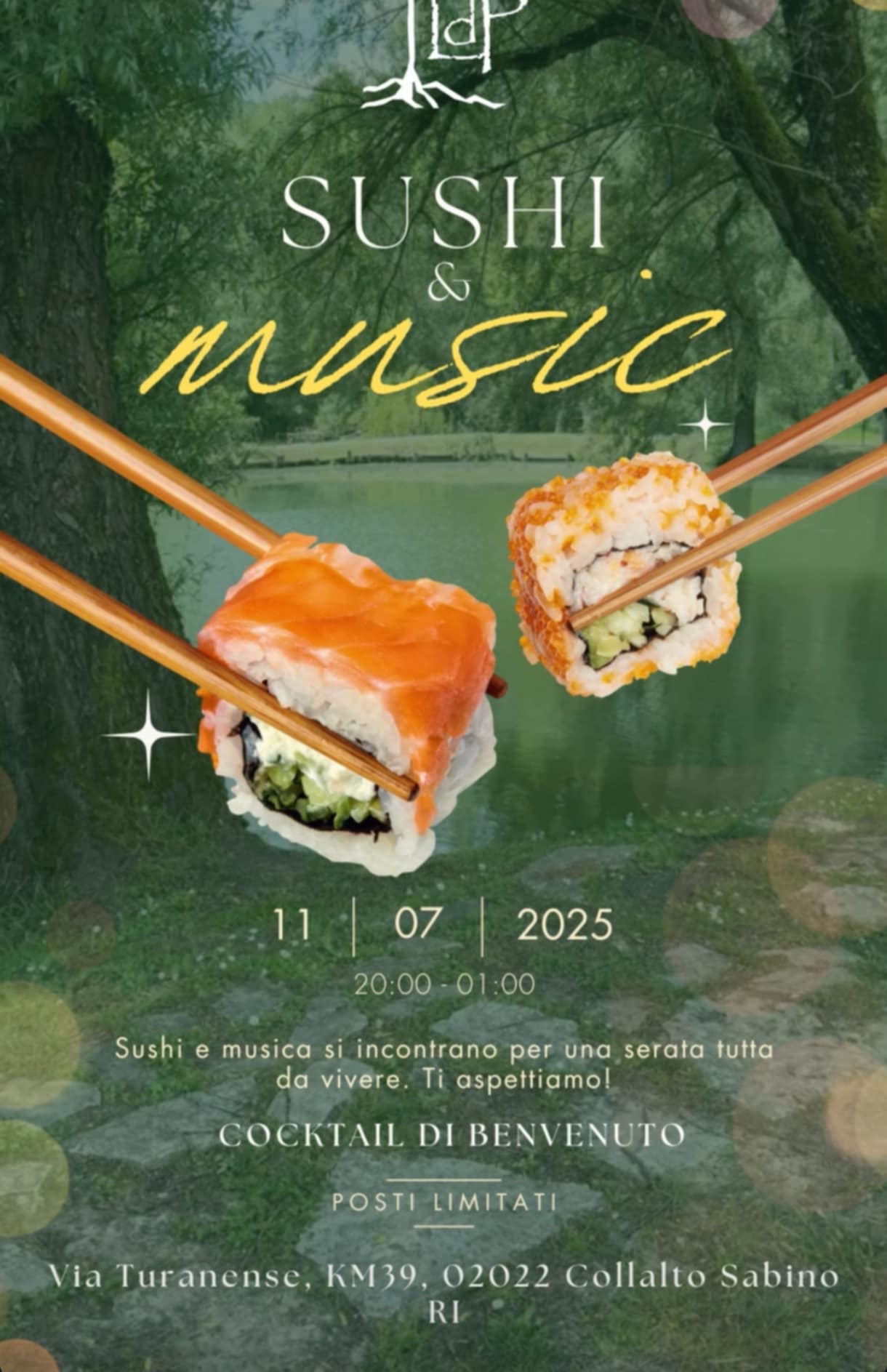 Immersa nel verde, a due passi dal Lago del Turano, la Locanda ospiterà un evento che unisce la raffinatezza del sushi alla magia della musica dal vivo, in un contesto suggestivo e rilassante. Dalle 20:00 all’1:00, gli ospiti saranno accolti con un cocktail di benvenuto, pronti a lasciarsi trasportare da sapori orientali e vibrazioni musicali.