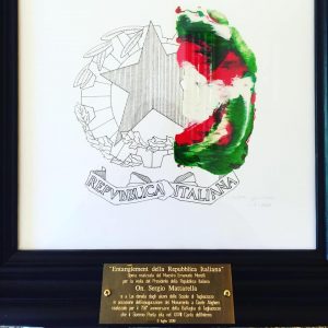 Repubblica rielaborato, contenente il ramo di ulivo che rappresenta la volontà di pace tra le nazione, sia nel senso della concordia interna che della fratellanza internazionale; il ramo di quercia che incarna la forza e la dignità del popolo italiano; la ruota dentata d’acciaio, simbolo dell’attività lavorativa; la stella, uno degli oggetti più antichi del nostro patrimonio iconografico, è sempre stata associata alla personificazione dell’Italia, sul cui capo essa splende raggiante. Nella parte di destra “l’Entanglement tricolore” una visione artistica, sviluppata nell’ultima mia ricerca, sul fenomeno della Fisica Quantistica, che rappresenta una particella, l’elemento più piccolo ed impercettibile presente in natura, fondamentale perché ci dà la vita. Questo fenomeno dell’entanglement dice che due o più particelle che per un certo periodo di tempo si sono legate tra di loro rimangono connesse anche a distanza e quindi quello che succede all’una si ripercuote istantaneamente anche sull’altra indipendentemente dalla distanza che le separa. Questa particella rappresenta ogni singolo cittadino italiano, un auspicio a riflettere e guardare cosa c’è attorno ad ognuno di noi, al concentrarsi sull’agire in modo sempre corretto perchè se danneggiamo qualcuno o qualcosa rischiamo di danneggiare anche noi stessi. Il popolo italiano deve rimanere unito, collegato e connesso per il bene comune, personale e per il paese in cui viviamo”. Un bellissimo messaggio di altissimo valore che riteniamo possa entrare a pieno titolo nella storia repubblicana.