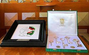 Tagliacozzo – “L’entanglement della Repubblica Italiana” è stato il lavoro da realizzato dall’artista il maestro Emanuele Moretti, in occasione della visita del Presidente, On. Sergio Mattarella, e specificamente del 750° anniversario della “Battaglia di Tagliacozzo” citata da Dante nel XXVIII canto della Divina Commedia. Il Sindaco Vincenzo Giovagnorio ha seguito ritualmente il cerimoniale di Stato per una Tagliacozzo resa ancor di più splendida dalla cornice del sole e della bellissima giornata estiva. Unica nota stonata è stata il fatto che il Presidente non abbia parlato, ma ciò era stato già prestabilito. Il presidente si è mostrato particolarmente sorpreso nel ricevere oltre che le chiavi simboliche della città anche l’entanglement di cui sopra. “Questa opera – spiega l’autore Emanuele Moretti – si divide in due parti, in quella di sinistra l’emblema della