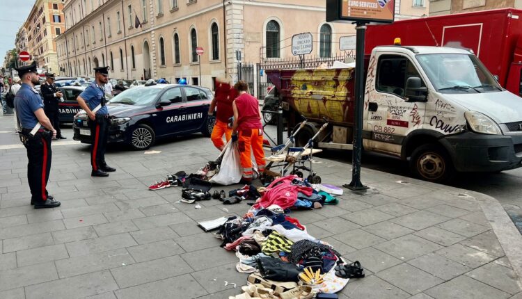 Nel corso dei controlli i Carabinieri hanno effettuato uno sgombero sul marciapiede di via Principe Amedeo, nel quartiere Esquilino, con l’ausilio del personale “Ama”, dove era stato allestito un mercatino abusivo da cittadini stranieri.
