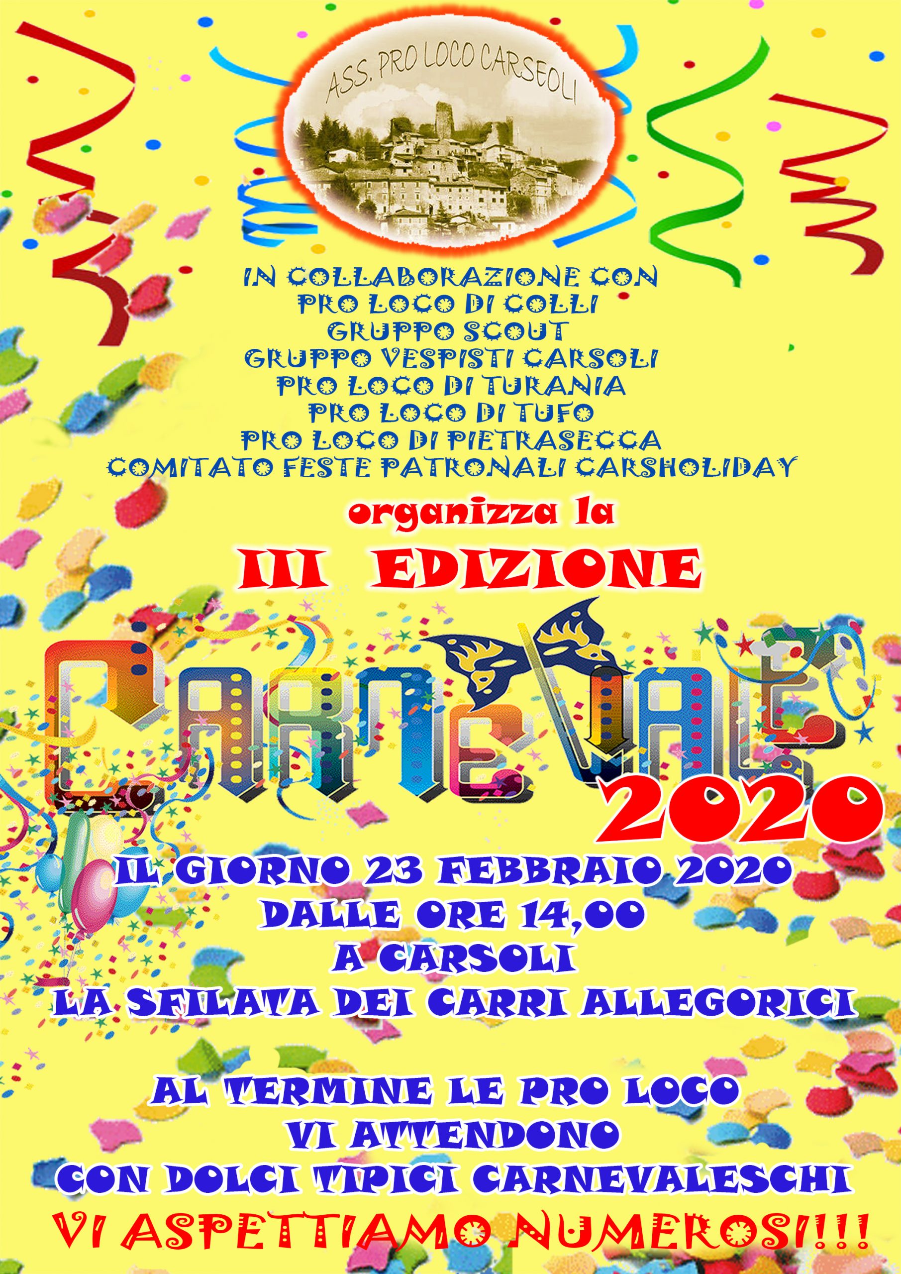 Carsoli – Grande attesa per domenica 23 febbraio 2020 per la terza edizione del Gran Carnevale a Carsoli.
