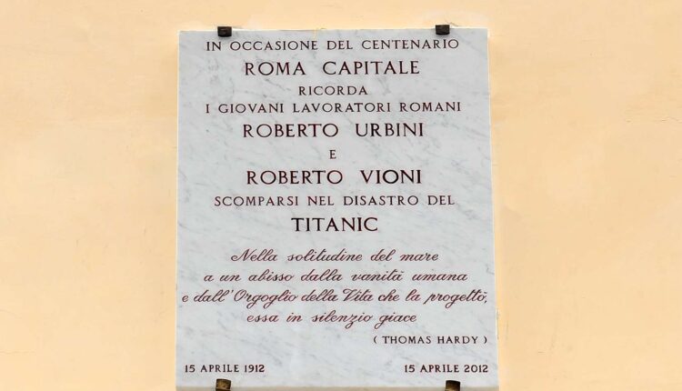 Era la notte tra il 14 e il 15 aprile del 1912 quando il Titanic si schiantò contro un iceberg, poco a sud di Terranova. A bordo del primo viaggio inaugurale del transatlantico inglese è appurato ci fossero anche diversi italiani: i nostri connazionali dispersi furono oltre cinquanta, per lo più lavoratori, non semplici passeggeri. Per il nostro Paese fu la prima grande tragedia dell’emigrazione dall’Unità d’Italia. Tra gli italiani morti nel disastro anche due romani, Roberto Vioni e Roberto Urbini, di 26 e 22 anni. Sono questi i nomi dei due romani riportati sulla targa. Lavoravano come camerieri nell’esclusivo e prestigioso ristorante di prima classe “À la Carte”, a bordo del Titanic. I loro nomi risultano sui quotidiani dell’epoca e sono confermati dai documenti dell’Anagrafe capitolina. Una ricerca di oltre dieci anni fa ha riportato alla luce due cartoncini ingialliti e vergati a mano, conservati per un secolo negli uffici di via Petroselli, sede dell’Anagrafe, con i nomi dei due ragazzi e la data della morte, per entrambi il 15 aprile 1912, accanto una scritta che non lascia dubbi sull’esito della storia: “Disastro Titanic”.