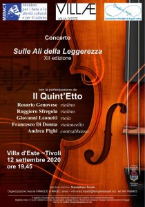 Lo straordinario spettacolo di musica si terrà nella magica cornice del chiostro di Villa d’Este, sabato 12 settembre 2020 alle ore 19.45. Ad allietare la serata sarà “Il Quint’Etto” formato da professori dell’Accademia Nazionale di Santa Cecilia. “Il Quint’etto” è un quintetto d’archi (due violini, viola, violoncello e contrabbasso) che trova le sue origini nello studio del repertorio classico. I cinque musicisti di formazione classica hanno avuto vaste esperienze in altri generi musicali, hanno così unito le proprie competenze musicali apportando ognuno il proprio “etto” di cultura. Il programma comprende brani di ogni tipo e genere: classico rivisitato, rock, jazz, pop, melodico, tango, dance che coinvolgerà il pubblico in una s-travolgente e appassionante atmosfera.