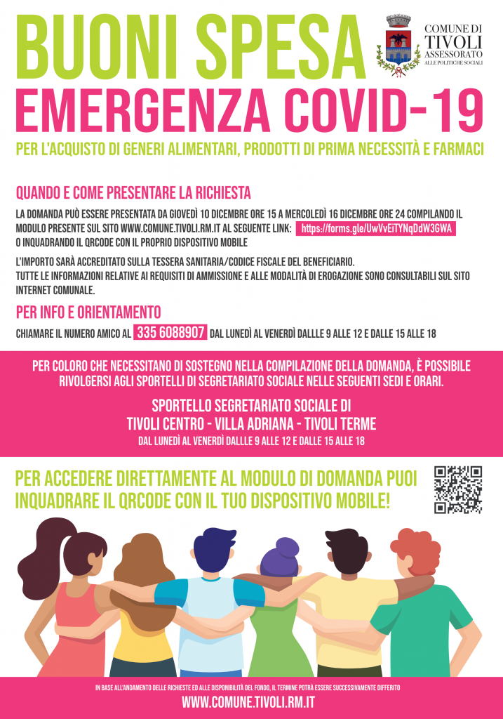 Tivoli – A partire da giovedì 10 dicembre e fino a mercoledì 16 dicembre è possibile presentare domanda al comune di Tivoli per ottenere i buoni spesa per acquistare generi alimentari, farmaci e beni di prima necessità. È la seconda trance di contributi statali e regionali trasferiti ai Comuni dal Governo e dalla Regione Lazio per consentire alle persone in condizioni di bisogno di soddisfare le necessità più urgenti ed essenziali, introdotti con il decreto legge del 23 novembre scorso (“Misure di solidarietà alimentare”) e in attuazione dell’ordinanza del Dipartimento della protezione civile del marzo scorso e della delibera della Regione firmata invece a novembre. Le risorse totali assegnate al Comune di Tivoli ammontano a oltre 587.400 euro, delle quali circa 400mila provenienti dal Dipartimento di protezione civile e oltre 187.400 dalla Regione Lazio. La ripartizione dei fondi e le modalità di utilizzo sono le stesse fissate in occasione della prima erogazione dei buoni spesa. In base all’andamento delle richieste e alle disponibilità del fondo, la scadenza del 16 dicembre potrebbe essere rinviato.