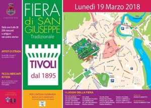 Lunedì 19 marzo a Tivoli è il giorno dedicato alla tradizionale Fiera di San Giuseppe. Dalle prime ore del mattino nelle vie e nelle piazze del centro storico saranno presenti 200 mercanti e artigiani, con esibizioni di artisti di strada e il mercatino del riciclo dei bambini in zona Duomo. Come consuetudine, nel giorno della Fiera gli istituti scolastici della città resteranno chiusi.