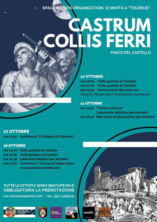 Colleferro – Con il finanziamento della Regione Lazio ed il Patrocinio del comune di Colleferro, nei giorni 10, 11, 17 e 18 Ottobre, presso il Castello Vecchio, si terrà l’evento “Tolerus, Castrum Collis Ferri”: la vita al Castello ai tempi del castello, con uno sguardo alle stelle.