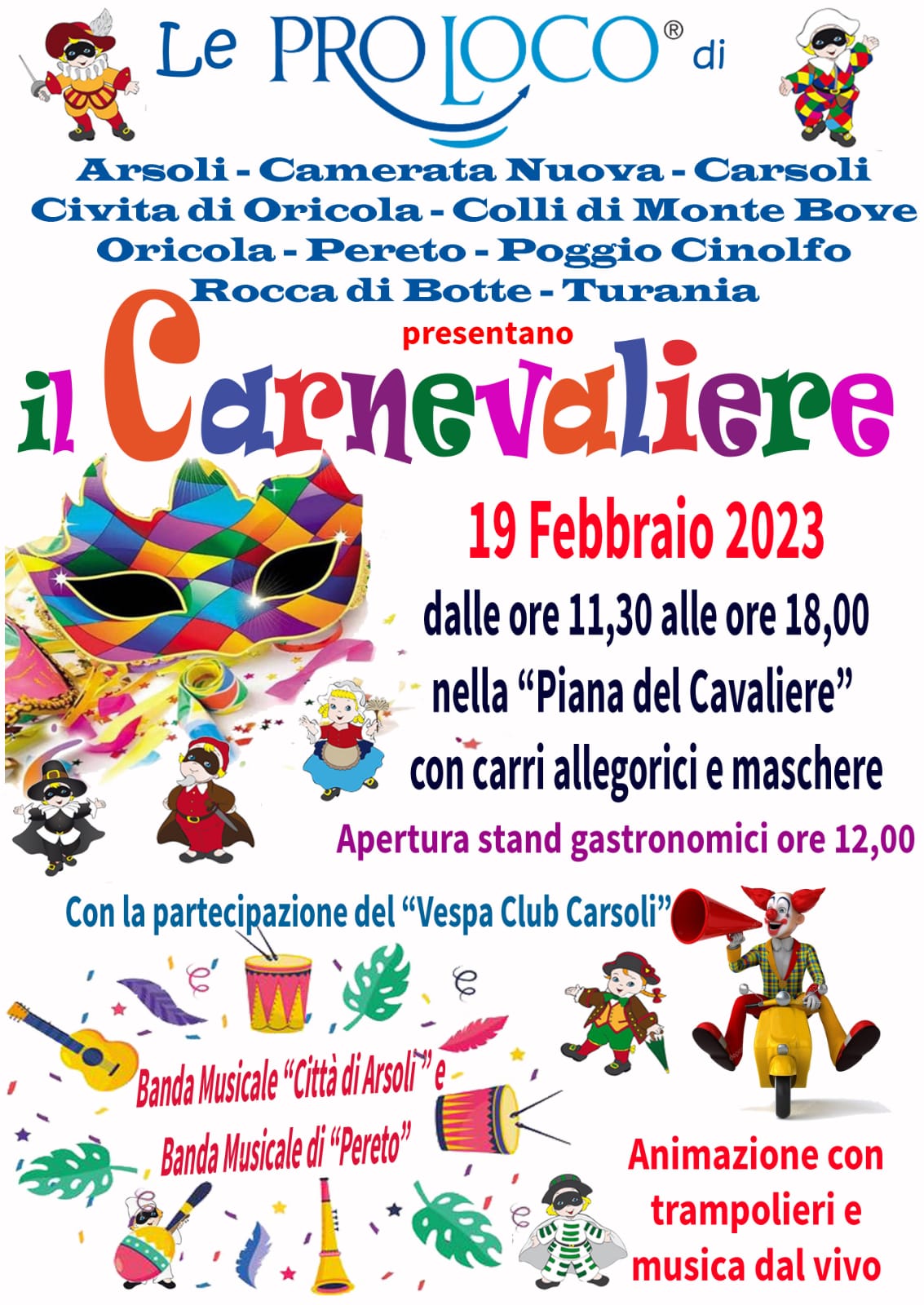 PIANA DEL CAVALIERE – Una intera giornata ed il carnevale torna in grande stile nella suggestiva cornice della Piana del Cavaliere. Le Pro Loco di Arsoli, Camerata, Carsoli, Civita, Colli di Monte Bove, Oricola, Pereto; Rocca di Botte, Poggio Cinolfo e Turania tutte insieme per restituire per la gioia di grandi e piccini la festa più attesa: il Carnevale. Una edizione speciale dunque con un appuntamento da non perdere per DOMENICA 19 FEBBRAIO 2023.