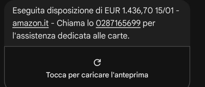 Il testo è breve, diretto e studiato per creare allarme: una transazione elevata, un marchio noto e la promessa di un supporto immediato. In realtà, dietro il messaggio non c’è né Amazon né un istituto bancario, ma un tentativo di frode.