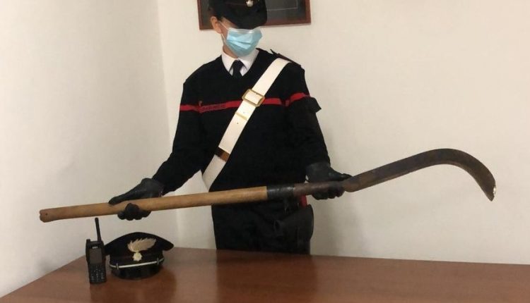 Giunti sul posto, i Carabinieri hanno intercettato il 65enne in una via limitrofa, camuffato con un vestito scenico da “morte” e con in mano una falce vera, dotata di lama ricurva, affilata ed appuntita lunga un metro e 35 cm.