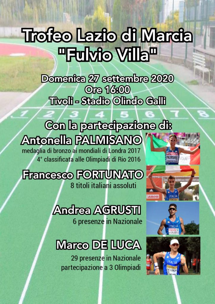 Tivoli – Decine di atleti di varie categorie parteciperanno domenica 27 settembre alla terza prova del “Trofeo Lazio di marcia Fulvio Villa”, che si terrà allo stadio comunale Olindo Galli di Tivoli dalle 16 alle 19:30. La gara, organizzata dall’Atletica Tivoli in collaborazione con il comitato regionale Fidal Lazio, rientra nel campionato regionale individuale cadetti e cadette 3^ prova su pista ed è inserito nel programma del “Settembre tiburtino 2020”.