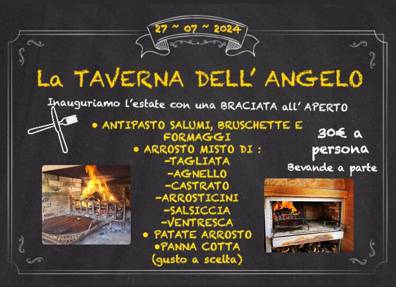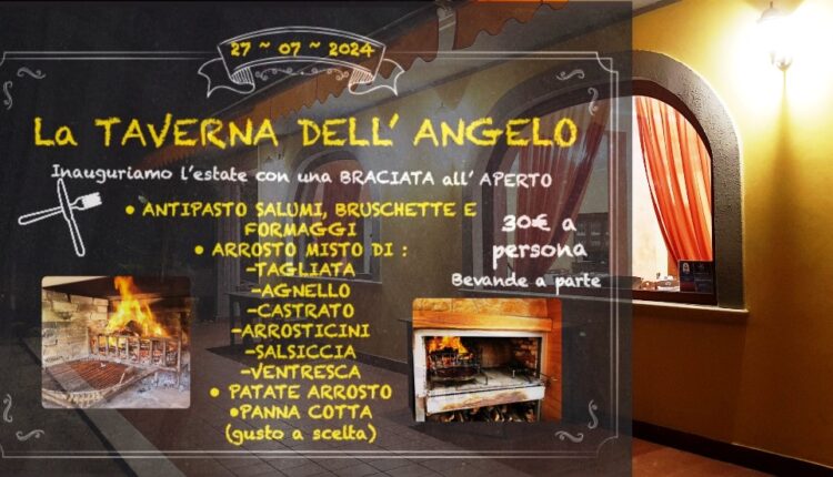 TUFO DI CARSOLI – Nella bella cornice del paese delle arti la fresca estate è alla Taverna dell’Angelo, fiore all’occhiello per accoglienza e ricettività nella ristorazione. Nel cuore della natura l’appuntamento è per sabato 27 luglio 2024 dalle ore 20.00 in poi: si inaugura l’arrivo del mese di agosto estate per eccellenza con una gustosa braciata all’aperto.