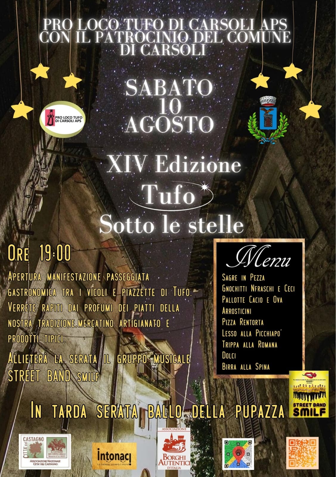 TUFO DI CARSOLI – La pro Loco di Tufo Aps con il patrocinio del comune di Carsoli ha organizzato la XIV edizione di “Tufo sotto le stelle”. L’appuntamento è per sabato 10 agosto 2024, di seguito il dettaglio evento:
