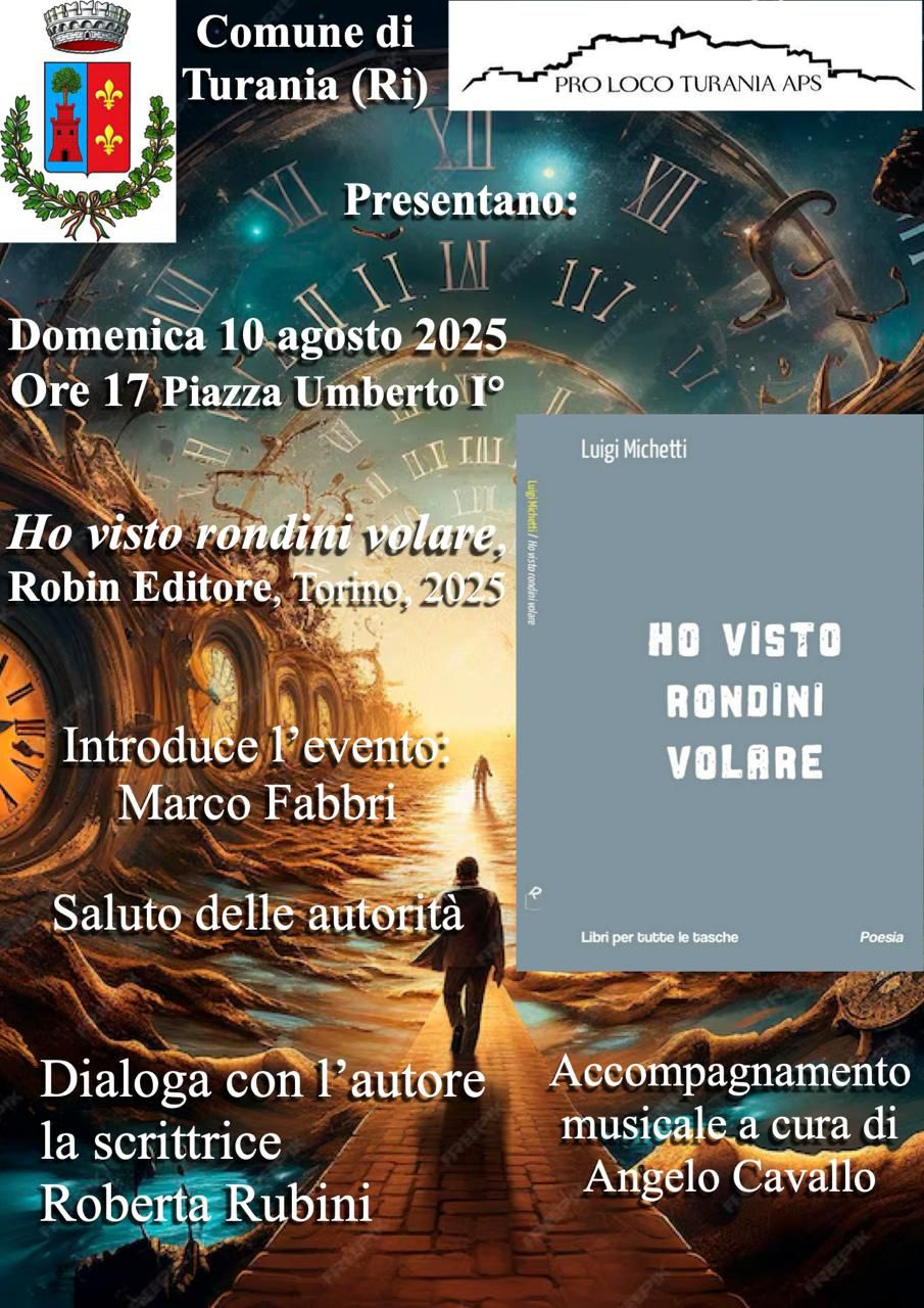 Turania – Domenica 10 agosto alle ore 17, presso piazza Umberto I a Turania, è attesa la presentazione del libro “Ho visto rondini volare” (Robin Edizioni, 20205) di Luigi Michetti. Introduce l’evento il Consigliere Marco Fabbri, dialoga con l’autore la scrittrice Roberta Rubini. L’evento sarà accompagnato dalle musiche dal vivo di Angelo Cavallo.