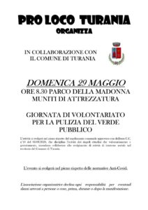Si terrà Domenica 29 maggio la giornata di volontariato per la pulizia del verde pubblico a Turania. Dalle ore 8.30 presso il parco della Madonna tutti i volontari, muniti di attrezzatura, potranno dedicare una mattinata ecologica nel rispetto dell’ambiente e del decoro urbano.