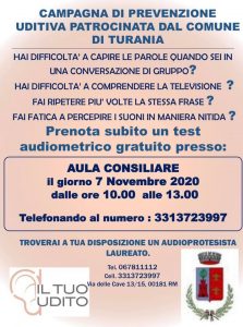 Turania – Sensibilizzare è importante, per questo il Comune di Turania ha a cuore da anni progetti di prevenzione rivolti a tutti i suoi cari cittadini. Sabato 7 novembre si dedicherà una mattinata alla prevenzione uditiva dando possibilità, a tutti coloro che vorranno aderire, di effettuare gratuitamente il test audiometrico, prenotando un appuntamento. Nel rispetto delle norme anticovid, la campagna di prevenzione avrà inizio partire dalle ore 10.00 fino alle 13.00 presso l’aula consiliare.