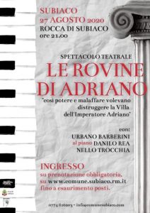 Subiaco – Posti esauriti per lo spettacolo  “Le Rovine di Adriano”, rappresentazione teatrale che andrà in scena giovedì 27 agosto nei giardini della Rocca Abbaziale di Subiaco. Con Urbano Barberini (voce narrante), Danilo Rea (pianoforte) e Nello Trocchia (testi), lo spettacolo rientra in una programmazione internazionale e vede coinvolte location e volti noti del panorama artistico. I numerosi iscritti, di ogni età e provenienza, saranno ospiti degli incantevoli spazi esterni della Rocca Abbaziale di Subiaco, una location suggestiva per lo spettacolo intitolato “Le Rovine di Adriano”.