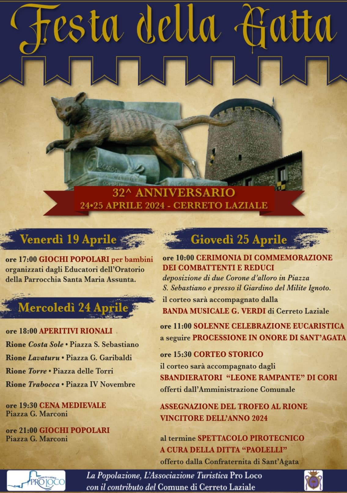 Cerreto Laziale – Grande attesa per la festa ed il palio della Gatta che si svolgerà come da tradizione il 24 e 25 aprile a Cerreto Laziale in provincia di Roma. Un evento giunto alla sua trentaduesima edizione. Di seguito il dettaglio programma: