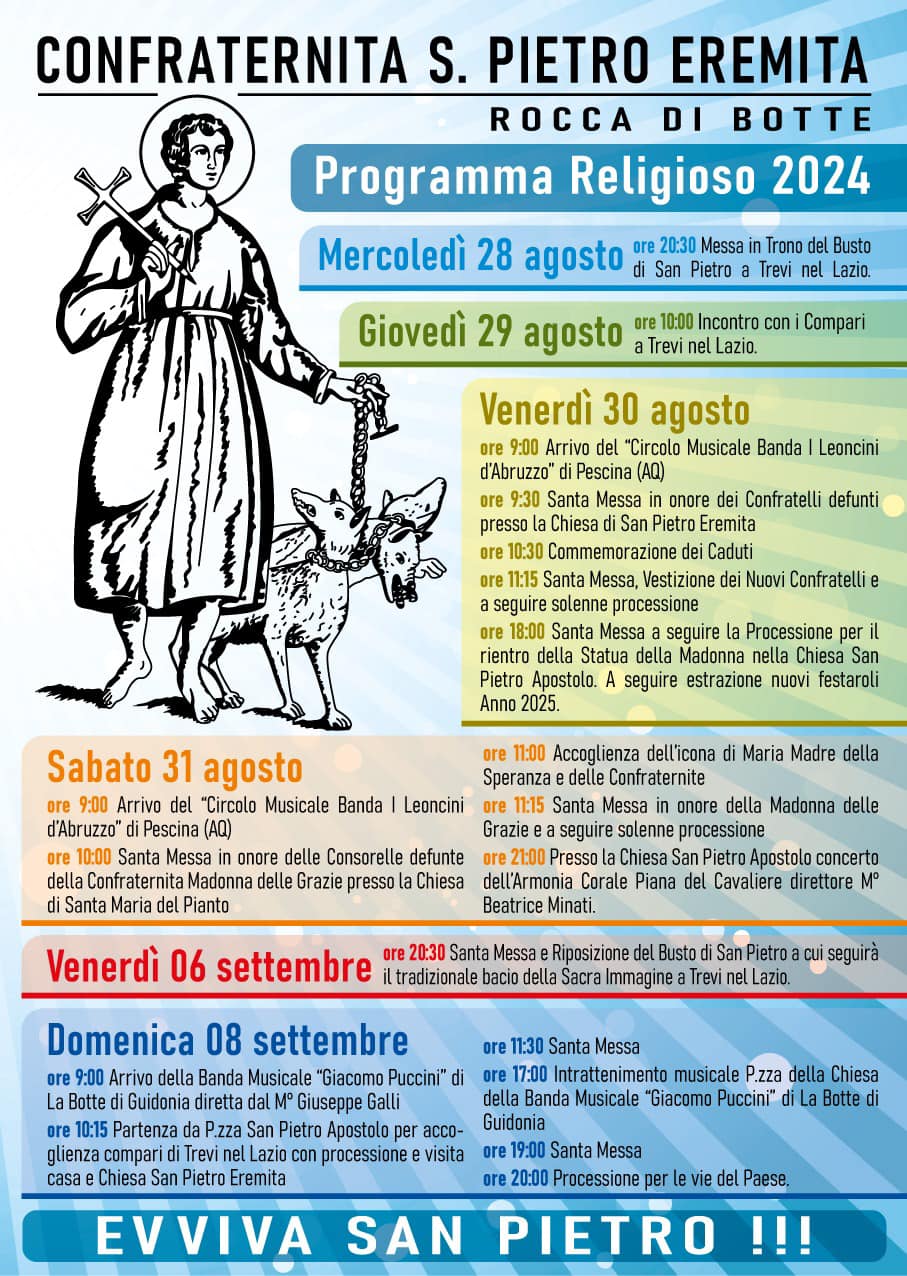 ROCCA DI BOTTE – Festeggiamenti pronti per il detto storico: “trenta e trentuno non manchi nessuno”. Una duegiorni in cui tutti i roccatani si ritrovano per festeggiare San Pietro Eremita.  Questo il programma religioso reso noto dalla confraternita che porta il nome del Santo.