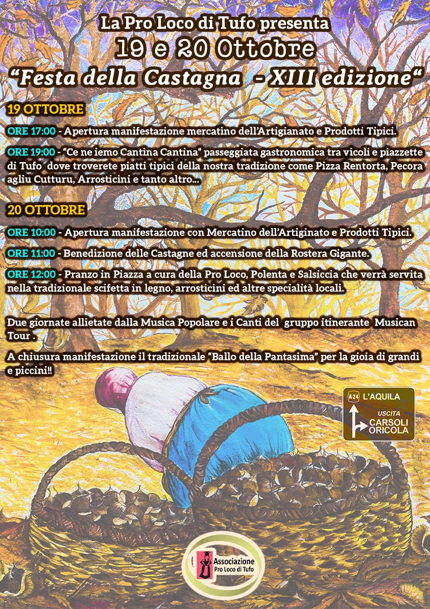 Tufo di Carsoli – C’è grande attesa a Tufo di Carsoli per la tredicesima edizione della “Festa della Castagna”, una due giorni di eventi ed iniziative che aprono le porte ai colori ed ai sapori della stagione autunnale.