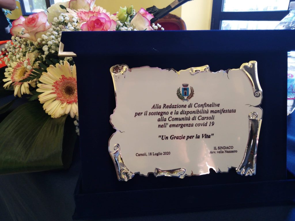 Una targa di riconoscimento è stata conferita anche alla testata giornalistica ConfineLive diretta dal giornalista e consigliere Odg Abruzzo Daniele Imperiale, rappresentata ieri dalla dott.ssa Elisabetta Zazza in qualità di capo redattrice, per la professionalità del servizio e l’aiuto svolto nella diffusione delle notizie. “Arrivare alla gente – così ha commentato il sindaco – non soltanto con l’aiuto ma anche con l’informazione e soprattutto con la corretta informazione è importante, e la testata giornalistica ConfineLive ha dato tutta la sua disponibilità in tal senso. In questo periodo, in cui si sono susseguiti decreti, proclami e cambiamenti continui, è stato necessario dare alle persone l’informazione giusta, anche sulle modalità di comportamento. Sui social durante il coronavirus sono circolate fake news, informazioni errate o che hanno creato allarmismo, e avere una testata che facesse arrivare alla gente la corretta informazione è stato fondamentale”.