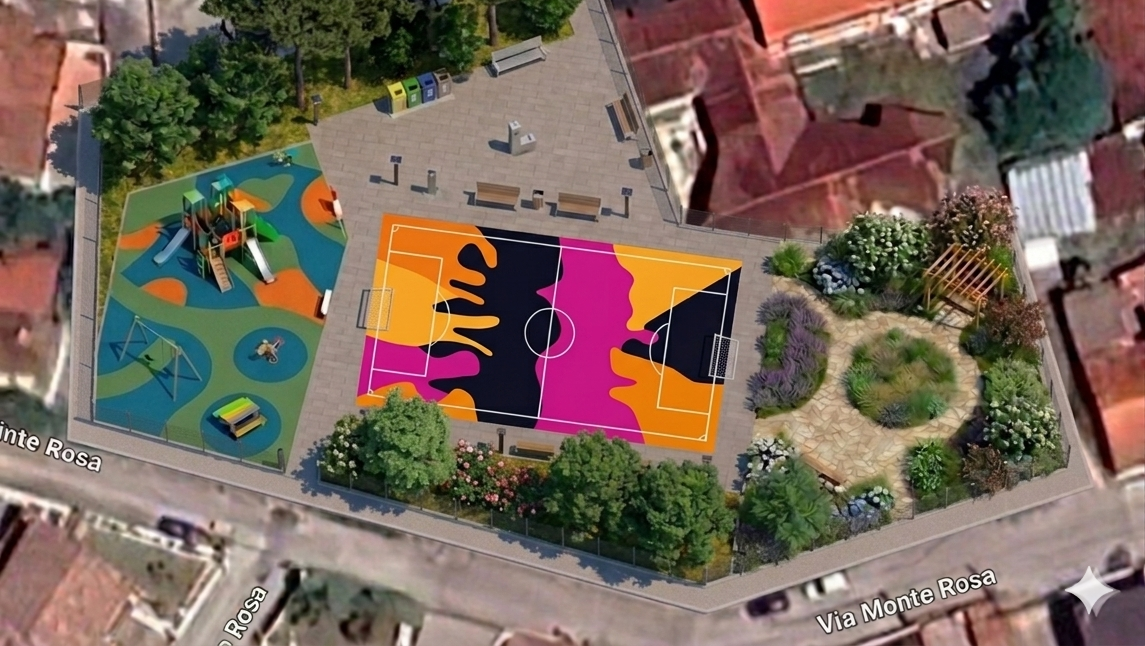L’intervento prevede la realizzazione di un nuovo campo playground, pensato come spazio moderno, sicuro e inclusivo, in linea con i campi polifunzionali già realizzati ad Antrosano e con quelli portati avanti nelle scuole Vivenza e Pomilio. Un’area caratterizzata da soluzioni innovative e da una forte identità visiva, destinata a diventare punto di riferimento per bambini, ragazzi e famiglie del quartiere.
