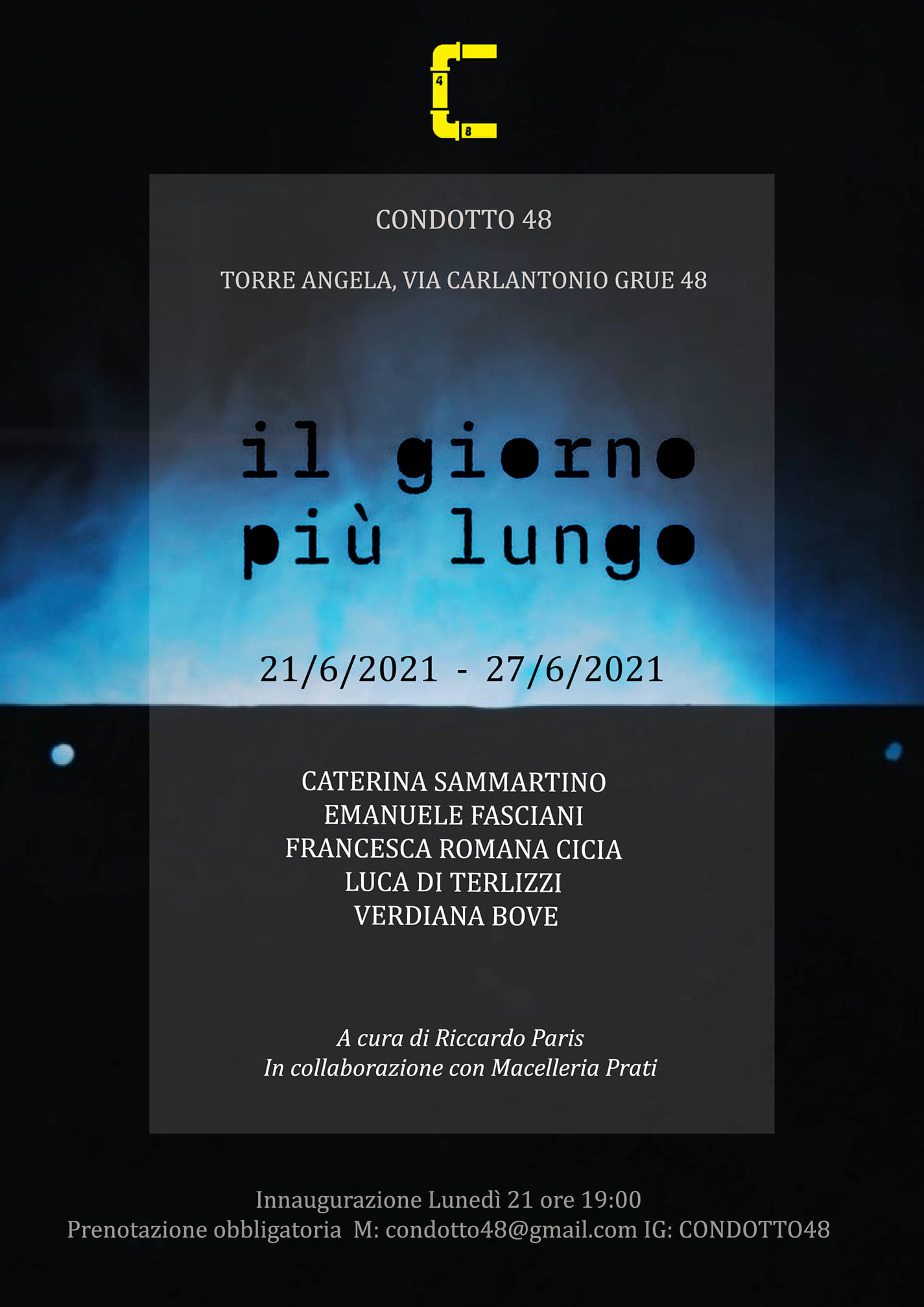 La prima mostra collettiva (che sarà visitabile fino al 27 giugno) è stata lanciata sotto il segno del solstizio d’estate: ne Il giorno più lungo, a cura di Riccardo Paris, il rapporto col tempo, con lo spazio e con la loro significazione soggettiva hanno infatti un ruolo centrale e le opere dei giovani artisti, nonché fondatori dello spazio (Caterina Sammartino, Luca Di Terlizzi, Verdiana Bove, Emanuele Fasciani, Francesca Cicia; tutti nati tra il ’94 e il ’98), dialogano materialmente fra loro, coabitano.