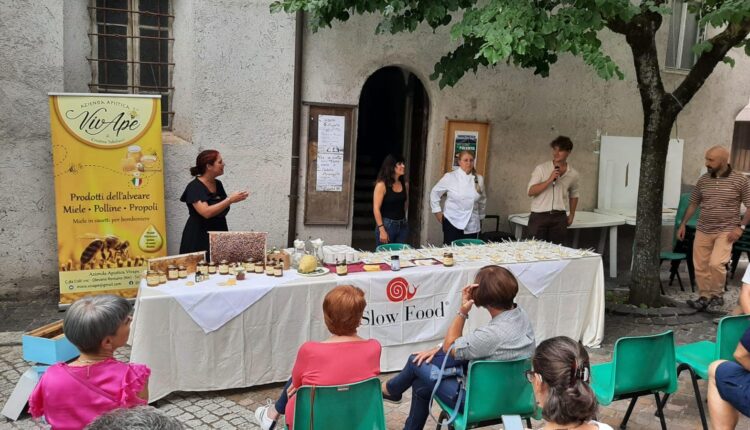 SARACINESCO – “Rigenerazione Slow ” per celebrare lo stare bene, in piazza, insieme… Saracinesco, Gusto di Natura, ha ospitato ieri l’altro il Laboratorio del gusto dedicato al Miele, condotto da Slow Food Tivoli e Valle dell’Aniene. In Piazza Roma, ieri tanti appassionati e curiosi, abitanti del luogo, soci Slow Food, produttori del territorio di extravergini, di pizzutello di Tivoli, apicultori amatoriali. Tutti in piazza, in un tempo sospeso, incantati dai racconti e deliziati dagli assaggi di mieli e melata di Roberta e Cristina, trasformando l’incontro in in una vera e sapiente conversazione filosofica.